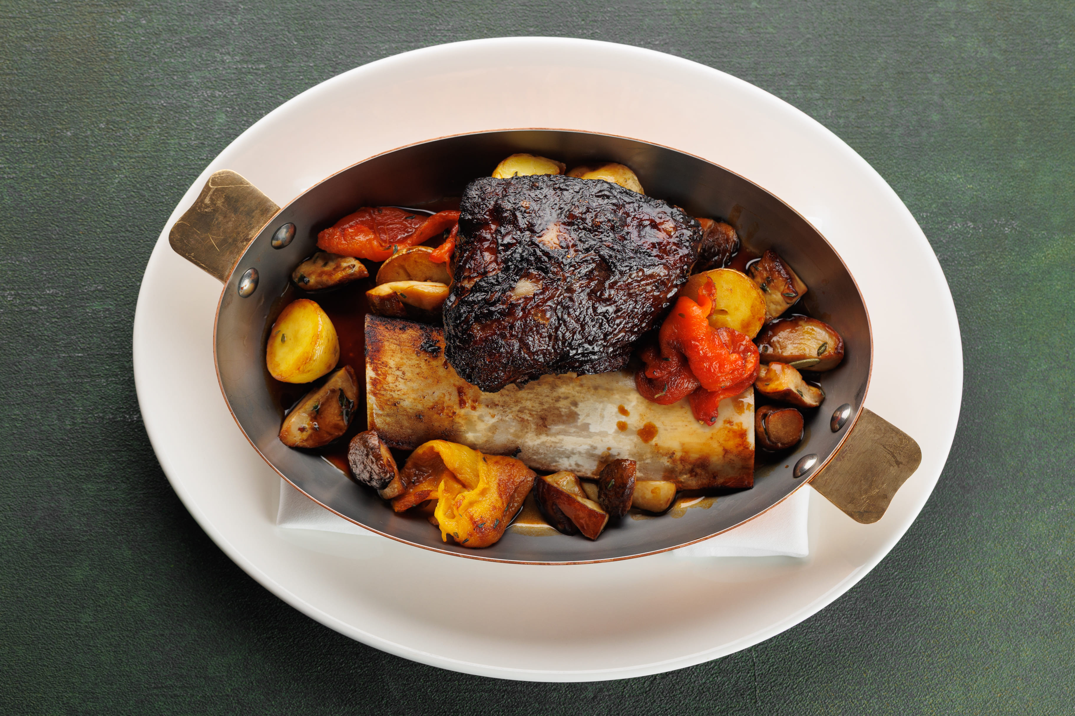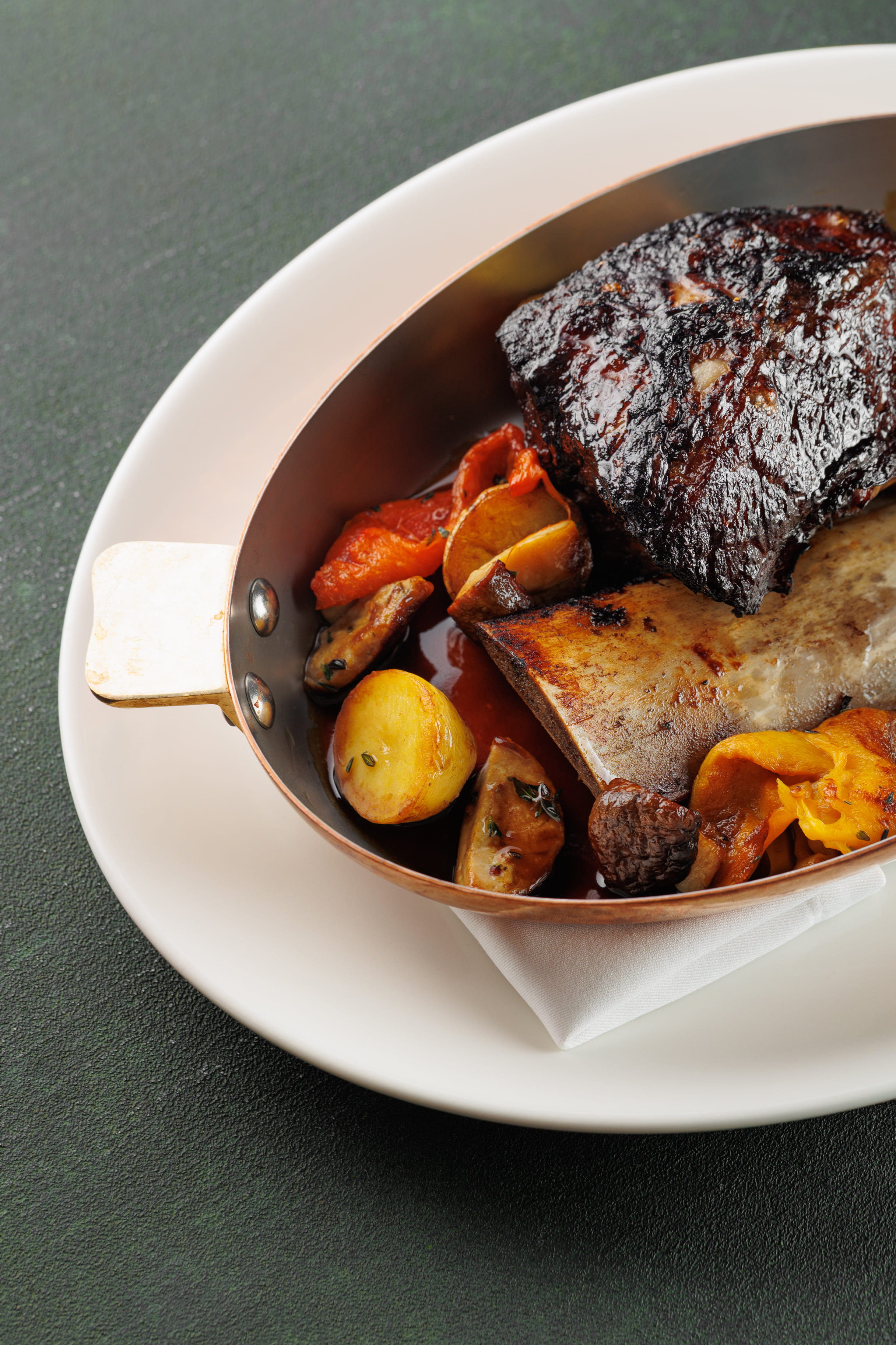 Каждому гостю будет предложено и ребро из мраморной говядины (5500 руб.), приготовленное методом су-вид. Блюдо подается с гарниром: мини-картофель, болгарский перец, белые грибы и соус с овощным гарумом.